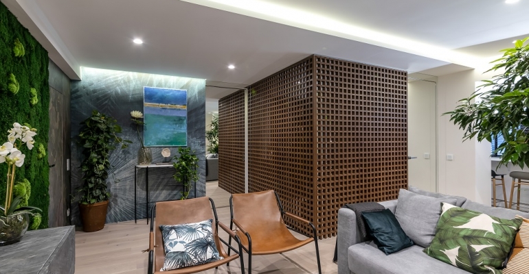 «Квартирный вопрос» создал гостиную, напоминающую об острове Бали, для героев, которые увлекаются серфингом. Помогли в этом двускатный потолок, будто на вилле, легкие перегородки из темного дерева, зеркала и настоящие джунгли из банана, фикуса, драцены, эпипремнума, лотоса и орхидей. Автор проекта – Шамсудин Керимов.