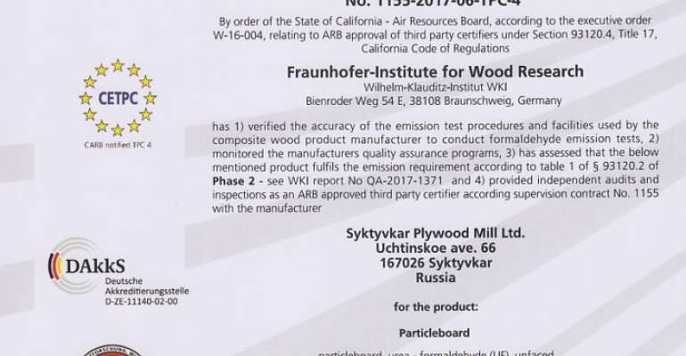 Первый сертификат ООО "СФЗ" соответствия ДСП/ЛДСП требованиям CARB