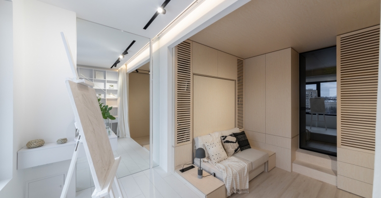 Отдельного внимания заслуживает спальная зона с кроватью-трансформером, которая легким движением руки превращается в зону отдыха с мягким диваном. Потолок и стены спальни укутали уютным деревянным покрывалом из высококачественной фанеры высшего сорта марки SyPly и ЛДСП в декоре "Парма" - самом недавнем, и уже полюбившемся всем из линейки Lamarty. Поверхность плиты в легком пастельном тоне с мягким струящимся рисунком стилизована под элитную фанеру, поэтому в паре с настоящей выглядят гармонично -легко и минималистично, тем самым запросто укладываются в небольшое пространство, отведенное для данной зоны. Дополняет образ и эффект натуральной поверхности кромка, имитирующая фанерный срез. Вместительная система хранения также сделана из березовой фанеры SyPly, для прочности покрытой водоотталкивающей пропиткой.