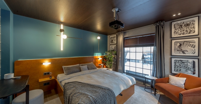 Дизайнеры решили разрушить представления о гардеробной, как о темном чулане и превратили ее в парадную прихожую. Чтобы попасть в спальню, нужно пройти мимо зазеркалья из фасадов шкафов. Они сделаны по эскизам авторов проекта в столярной мастерской из ЛДСП Lamarty в классическом древесном декоре "Ноче Амати 10". За зеркальными фасадами с легкими скруглениями скрываются вместительные полки, выдвижные ящики и антресоли. Расположиться с книгой или помечтать, глядя в окно, можно на широкой тумбе. Она заняла место по всей ширине спальни и отвечает изголовью кровати напротив. Для прочности тумба сделана на основе каркаса из металлической профилированной трубы и обшита ламинированными древесно-стружечными плитами Lamarty в декоре "Сосна Санторини". Имитация древесины сосны отличается изысканным и при этом живым характером благодаря грубой нешлифованной поверхности, лежащей в основе декора. Лёгкая трёхмерность текстуры этого декора усиливается с помощью оптического эффекта вымывания древесины. Несмотря на размер тумбы, она не выглядит тяжеловесной за счет утопленного цоколя, а будто парит над полом. Валики в эко-коже превращают тумбу-подоконник в подобие дивана. Три вместительных ящика подойдут для хранения пледов и подушек, а секция с откидным фасадом предназначена для техники домашнего кинотеатра.