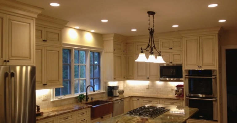 Переведем разговор об освещении в практическую плоскость. Итак, первый вариант для тех, кто не планирует отказываться от центральной люстры. Осветительный прибор должен давать достаточно яркий свет. Если последнего для отдельных зон кухни недостаточно, освещение дополняется несколькими подвижными светильниками. Они должны давать рассеянный, легкий свет.