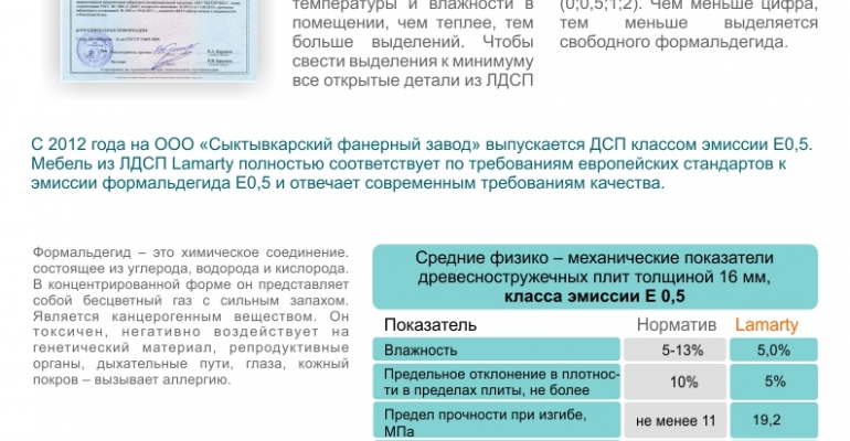 В августе 2012 г на ООО «Сыктывкарский фанерный завод» освоили выпуск ДСП классом эмиссии Е 0,5. Мебель из ЛДСП Lamarty полностью соответствует по требованиям европейских стандартов к эмиссии формальдегида Е0,5 и отвечает современным требованиям качества.
