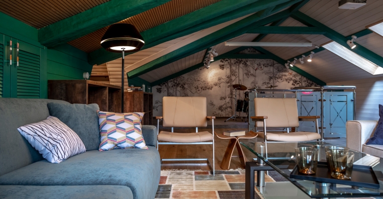 Мини-кабинет, библиотека, гостиная с двумя диванами, уголок эгоиста и шахматный клуб – теперь в мансарде для каждого члена семьи найдется подходящее место и занятие. Под скатами у круглого окна организовали зону мини-кабинета с библиотекой и коллекцией оружия хозяина дома. Библиотечные стеллажи сделаны из ламинированных древесностружечных плит Lamarty в декоре "Трансильвания". Микс текстур дерева и потертой кожи подчеркивает индивидуальность и статусность интерьера.