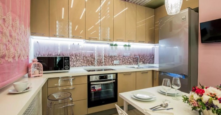 Замыкают ТОП-3 стеклянные фартуки. Жаропрочное стекло – хороший выбор для любой кухни, от классики до хай-тека. Чаще всего стеклянный фартук защищает обои или служит самостоятельным элементом дизайна, например, если оформлен в технике 3D-печати. Модели с рисунком лучше сочетать с однотонной мебелью без выразительного декора. Ее фасады могут быть выполнены из МДФ, ДСП с пленочным, пластиковым покрытием. Хотите кухню необычного цвета, планировки? Обращайтесь к профессионалам. Дизайнеры мебельного ателье воплотят в жизнь ваши креативные идеи.