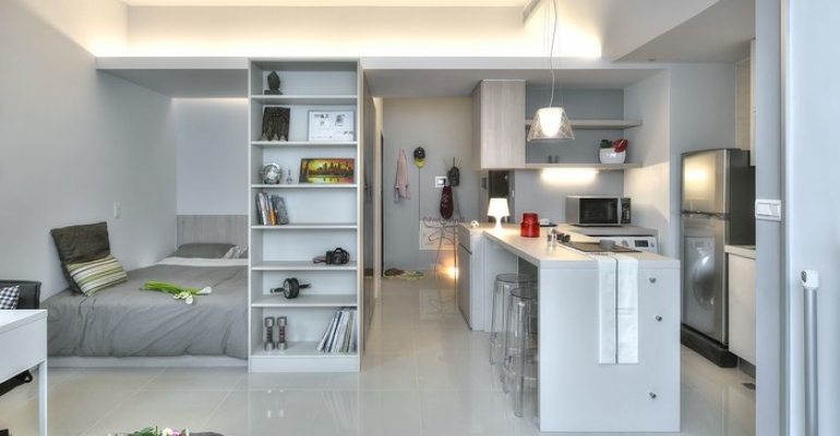 Другой вариант отделения кухни в квартире-студии – передвижные перегородки и ширмы. Первые могут быть на колесиках. Конструктивные решения предлагаются производителями самые разные. Классика жанра – неглубокий двусторонний или сквозной стеллаж.