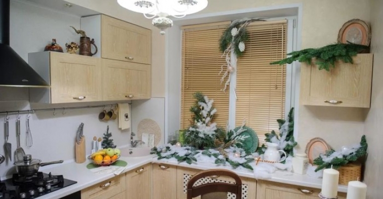 В малогабаритном помещении лучше использовать венки и гирлянды из елочных веток. Причем живые покупать совсем не обязательно. Искусственная хвоя практична и удобна для декорирования. Ключевые точки – зона над обеденным столом или барной стойкой, кухонным островом, если таковой имеется, и над окном.