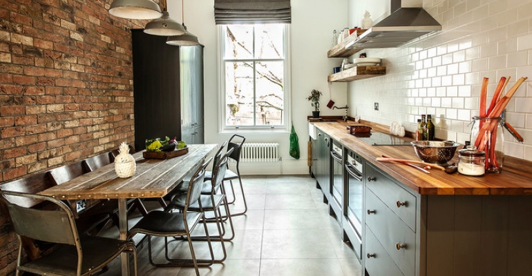 Предпочитаете натуральные фактуры? Используйте краску в качестве отделки. Окрашенная кирпичная стена легко моется, очищается от загрязнений. Последние на кухне – обычное дело. В погоне за эффектным интерьером не стоит забывать об особенностях оформляемого помещения. Идеально чистой может быть только демо-кухня. Если использовать помещение по назначению, от уборки никуда не деться. Соответственно, к выбору материалов следует подходить ответственно.
