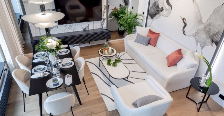 Пространство гостиной поделено на две части: зону гостиной и зону столовой. Но разноуровневое панно за телевизором (тонированные зеркала, керамогранит под мрамор и графичные темные деревянные вставки) собирают пространство воедино.