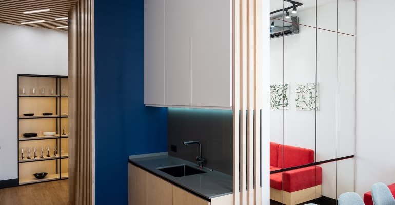 Фанеру использовали для оформления кухни, столовой зоны и коридора. На стенах автор проекта использовала прием, характерный скорее для загородной и дачной архитектуры, а именно – деревянные рейки. При этом чтобы не вводить дополнительную деревянную фактуру, для них использовали ту же фанеру, что и для изготовления мебели. Для удобства рейки сначала закрепили на подложке, после чего перегородку монтировали целыми панелями. Дверь в санузел оформили точно такими же реечными панелями, полностью растворив её на фоне стены.