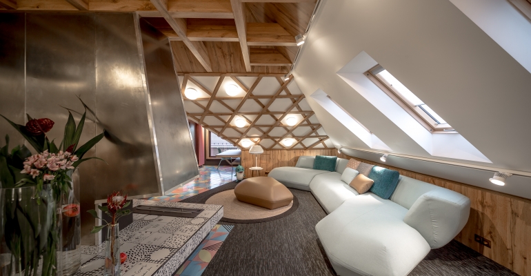 Стены декорировали панелями из ламинированных ДСП Lamarty, сняв острый вопрос углов между скатами и полом. Пространство под коньком украсили деревянными панелями. Белые холсты, которые появились над поясом из ЛДСП-панелей, не оставили без отделки. Усиливая графичность пространства, скаты украсила сложная обрешетка из реек в декоре дуб Вотан. Необычную геометрию помещения подчеркнула отделка потолка со сложной обрешеткой с вкраплениями накладных светильников.